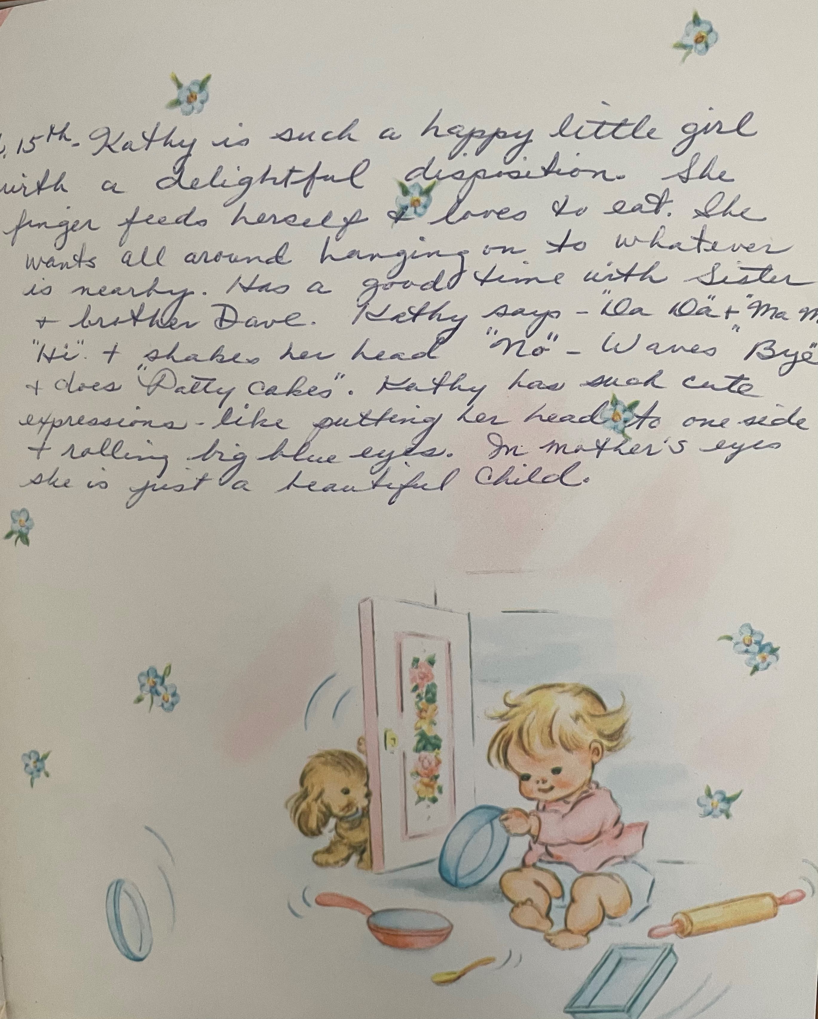 My mother also kept a baby book for each of us. Of course, the oldest not only had the most cards saved, but probably had the most written in her baby book- rite of passage, and that’s understandable. Probably what struck me the most from my baby book was a small passage my mother wrote about me at just over a year old. I can be sappy when I let go, and that paragraph just hit me. It’s hard to think of yourself as a baby, even harder to picture your parents, now in their mid-80’s, as a young couple raising babies. Your brain starts to make the connections from you raising your children to your parents raising you, and although you can’t possibly relive their memories, a bond is formed from child to parent when you make the effort to put yourself in their shoes.