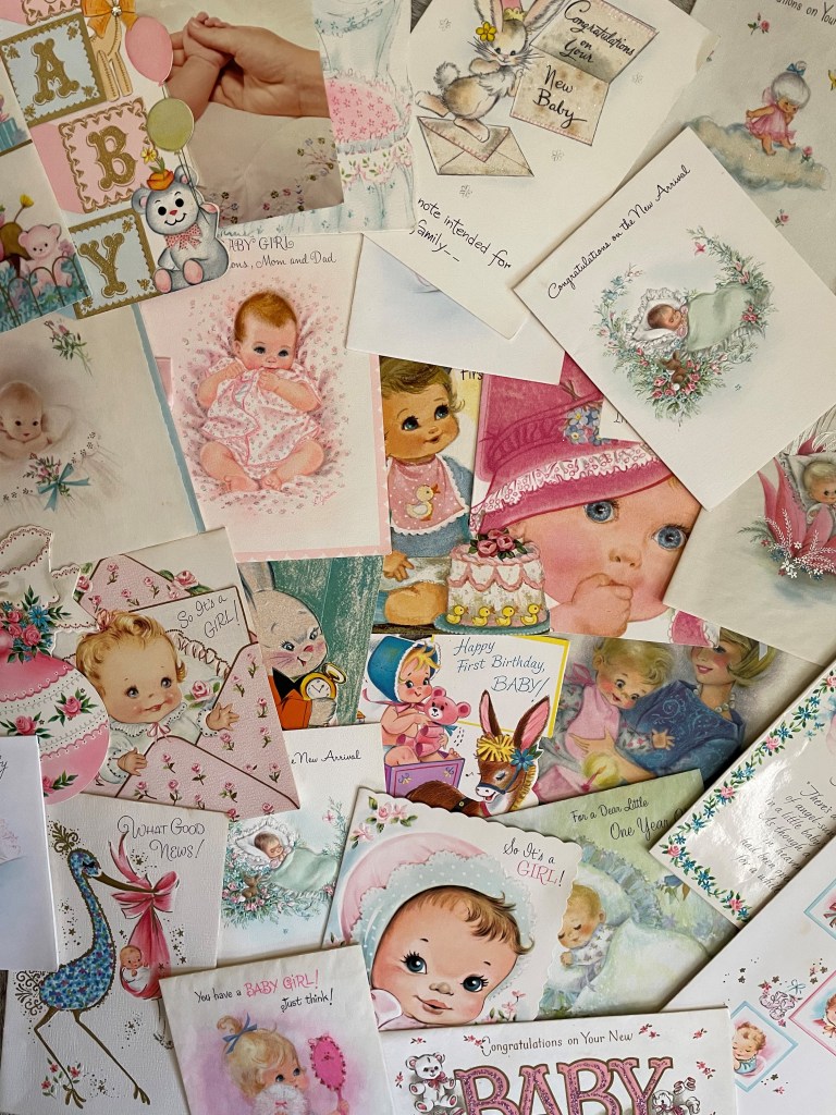 The cards are incredible! Artistically, I can appreciate the designs from the 1960’s. There is just a different quality to them; they are timeless. The notes I read in each one means so much; people’s names I recognize and those I don’t. It gives me an avenue to reflect upon my parents at that time; a young couple just 28 years-old welcoming their third child into the world, and their friends and family reaching out to share in their excitement. My mother was busy with two already in tow; just the fact that she kept the cards and even small notes attached to bouquets of flowers is incredible.