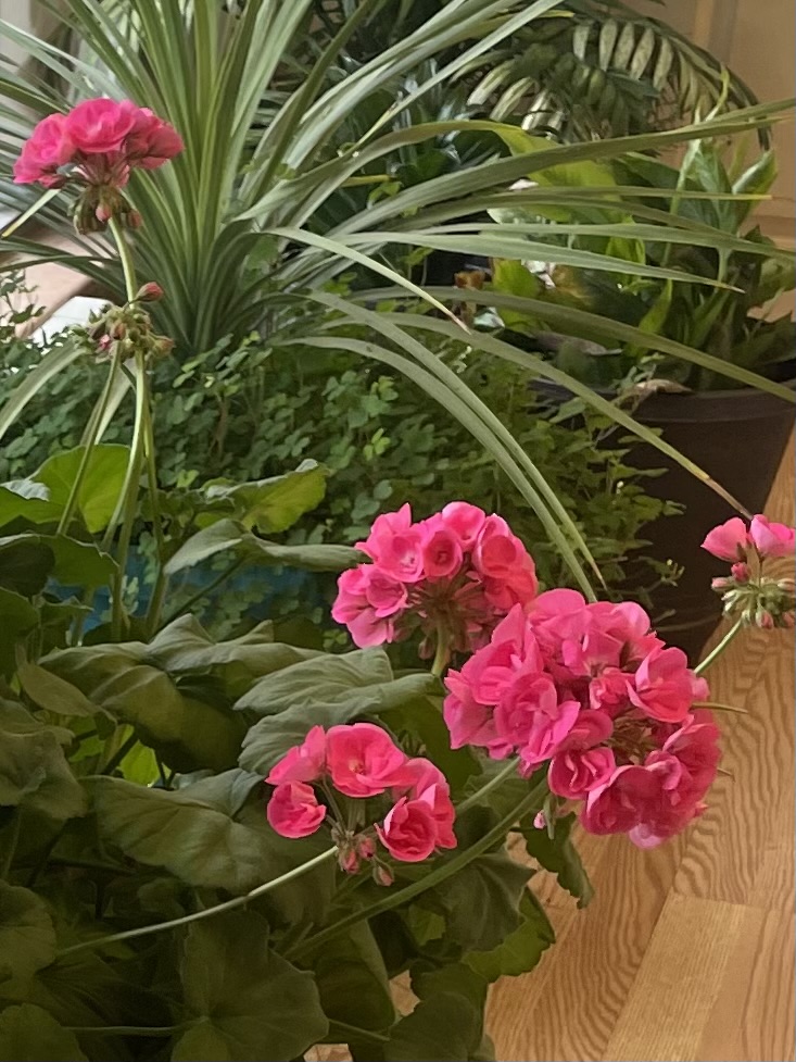 My visits to the dry cleaner are less frequent these days; my husband doesn’t travel as much for work anymore, but today I had one shirt to drop off. The owner and I usually partake in a quick chat about the weather, our children, vacations, etc.; he loves to chat, but today I couldn’t help but remark about the fantastic geranium plant reaching out far and wide by the front window.