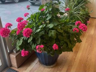 My visits to the dry cleaner are less frequent these days; my husband doesn’t travel as much for work anymore, but today I had one shirt to drop off. The owner and I usually partake in a quick chat about the weather, our children, vacations, etc.; he loves to chat, but today I couldn’t help but remark about the fantastic geranium plant reaching out far and wide by the front window.