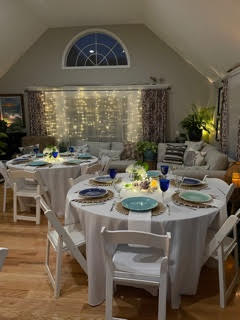 When you’ve planned a wedding reception for outdoors, without a tent, you always need a back-up plan. Thank God for a large family room, many hands to get the furniture moved, and a bit of creativity. Within a few hours we had three tables set for guests, shear fabric adorning windows and closet doors, and twinkle lights adding warmth and sparkle to greenery. It was, without doubt, a transformation.