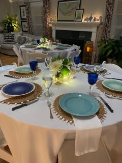 Simple white napkins purchased, along with nine dishes of varying color but similar style. Nine more blue plates I already had, along with blue and clear water glasses round out the table settings.